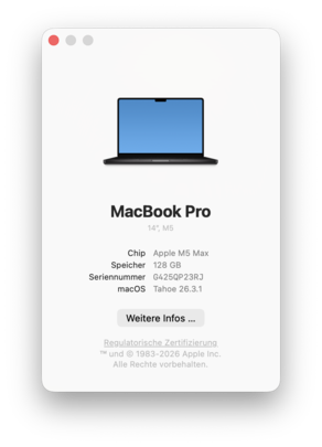| Apple MacBook Pro 14 2026 M5 Max Apple M5 Max ⎘ Apple M5 Max 40-Core GPU ⎘ 128 GB RAM, 8192 GB SSD | Bestpreis 7575€ Cyberport.de 2. 7639€ Cyberport.at 3. 8244€ MacTrade8589€ | 1.6 kg | 15.5 mm | 14.20" 3024x1964 254 PPI Mini-LED | |
