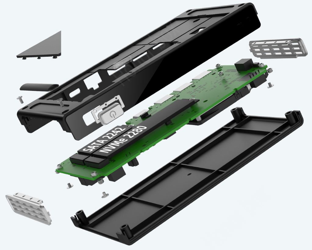 Ungewöhnlich: Der M6 unterstützt die Installation gleich zweier SSDs. Dabei wird die M.2280-SSD über NVMe und damit PCIe angebunden, für die zweite SSD steht ein M.2 2242-Steckplatz bereit, welcher nur über SATA angeschlossen ist. Das System kann mit einer bis zu einen Terabyte fassenden NVMe-SSD bestellt werden.