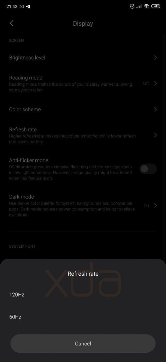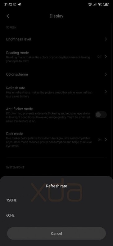 An anderer Stelle wird zudem ein 120 Hz-fähiges Display erwähnt, welches bislang nur in den älteren Razer Phones und dem Asus ROG Phone II (bei Amazon-Händler bereits ab 950 Euro gelistet) zu finden ist. Hier liefert das XDA-Team sogar Screenshots (siehe unten), die eine entsprechende Option in den Display-Einstellungen erkennen lassen. Unklar ist aktuell, ob wir es hier mit einem Smartphone mit allen drei neuen Features zu tun haben, oder ob es sich letztlich um unterschiedliche Xiaomi-Flaggschiffe handeln wird.