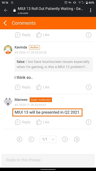 Zwei Quellen erwähnten bereits MIUI 13 und dessen wahrscheinlichen Launch im zweiten Quartal des Jahres, also letztlich bis Ende Juni 2021. So gab es bereits Ende 2020 Berichte von Plunikaweb oder Gizmochina über den Forumseintrag eines Moderators in der globalen Mi Community, der "bestätigte", dass MIUI 13 im zweiten Quartal 2021 präsentiert werden soll, einen Screenshot seht ihr unten. Auch wenn es sich bei dem Poster um einen Super Moderator handelt, muss das nicht bedeuten, dass diese Person auch tatsächlich in die internen Launchpläne des Unternehmens eingeweiht ist, weswegen bei dieser Aussage noch etwas Vorsicht angebracht scheint.