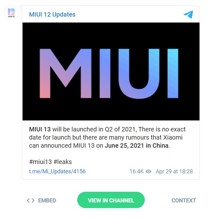 Es gibt allerdings noch eine zweite aktuelle Quelle für die MIUI 13-Gerüchte rund um einen Launch im Juni und die stammt aus dem Telegram-Kanal von Mi_Updates. Dort wird sogar ein konkreter Launchtermin kolportiert und zwar der 25. Juni. (siehe screenshot unten) Auch hier gilt: Bestätigt ist dieser Termin noch nicht, zudem bezieht sich dieses Datum, sofern es hält, erst mal nur auf den China-Launch und dürfte wohl auch die Verfügbarkeit der ersten chinesischen Beta-Versionen für einige aktuelle Xiaomi-Flaggschiffe wie etwa das Mi 11 Ultra markieren, das noch im Mai auch in Europa starten soll. Über die Verfügbarkeit der ersten globalen MIUI 13-Versionen kann derzeit nur spekuliert werden, manche Nutzer von Xiaomi-Handys warten jetzt noch auf das MIUI 12-Update.