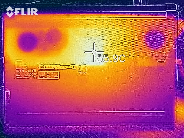(-) Auf der Unterseite messen wir eine maximalen Wert von 46.9 °C (im Vergleich zum Durchschnitt von 39.2 °C).