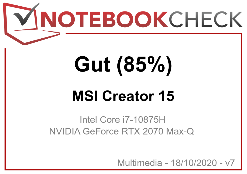 | 84.7 % v7 (old) | 10 / 2020 | MSI Creator 15 i7-10875H, GeForce RTX 2070 Max-Q | 1.9 kg | 22 mm | 15.60" | 3840x2160 | |