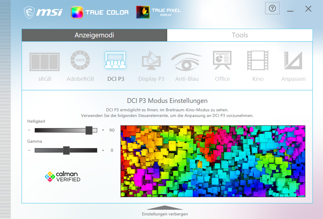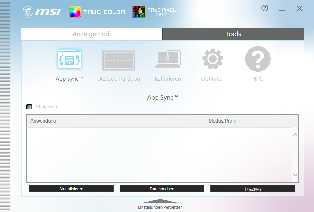 Das ab Werk kalibrierte Display deckt den Farbraum DCI-P3 vollständig ab. Dieser erweiterte Raum wird jedoch nicht immer benötigt oder kann auch störend wirken, etwa im Office-Einsatz mit Mail und Excel. Hier kommt MSI True Color ins Spiel. Dort kann der Anzeigenmodi gewählt werden, der zum Szenario passt. Mit App Sync können Programme zugeordnet werden. So wird das passende Farbprofil beim nächsten Start von Photoshop automatisch aktiviert.