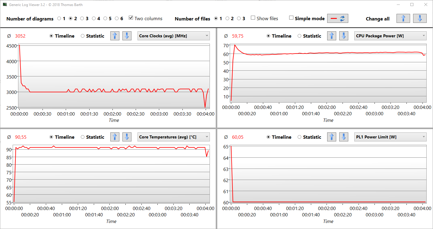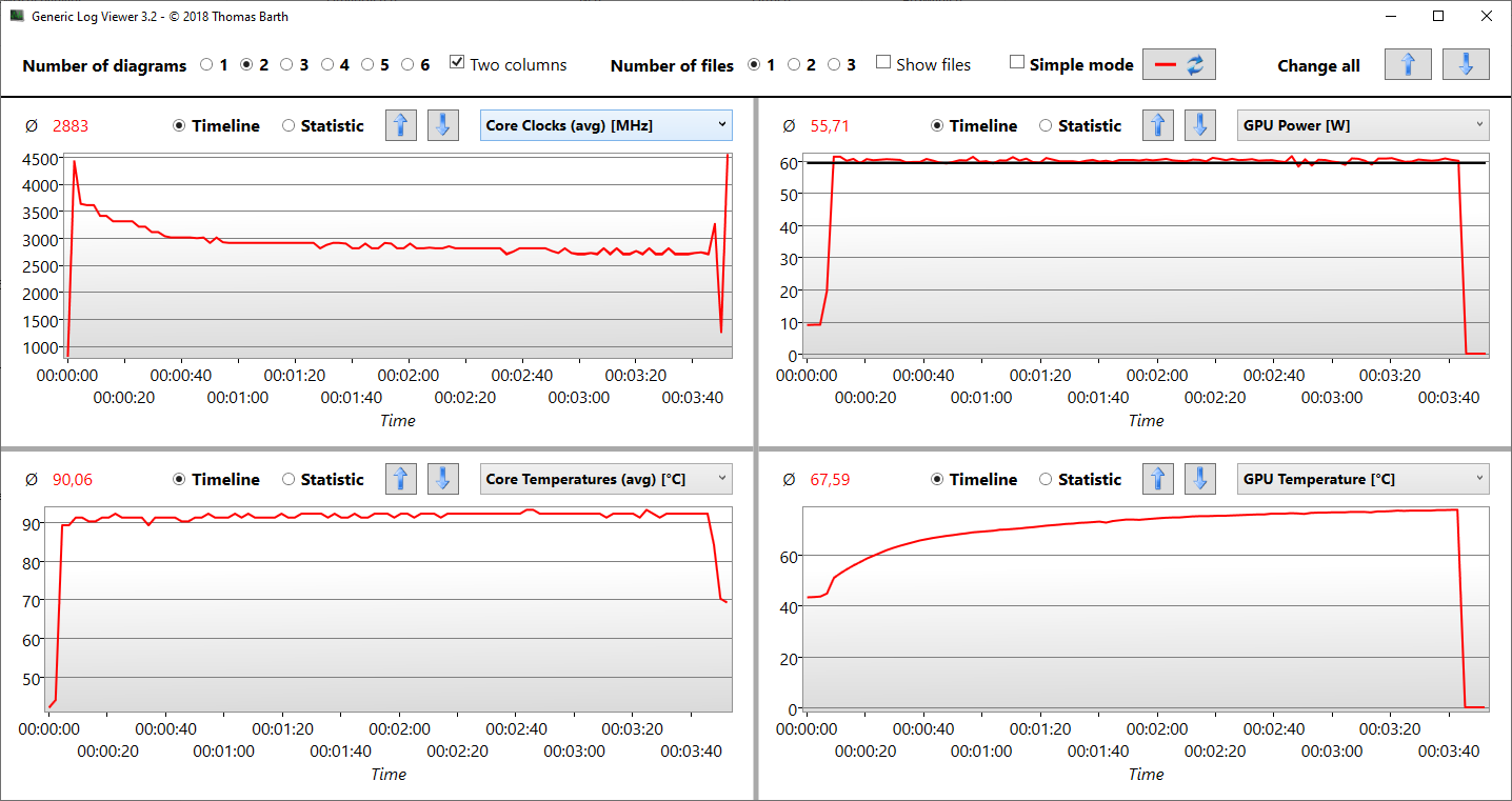 | CPU Clock (GHz) | GPU Clock (MHz) | Average CPU Temperature (°C) | Average GPU Temperature (°C) | |