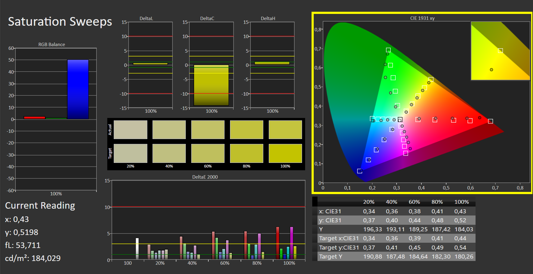 | AdobeRGB 1998 Coverage (%) | 96 | 86.5 -10% | 69 -28% | 77.4 -19% | 100 4% | 98.1 2% | 88 -8% |