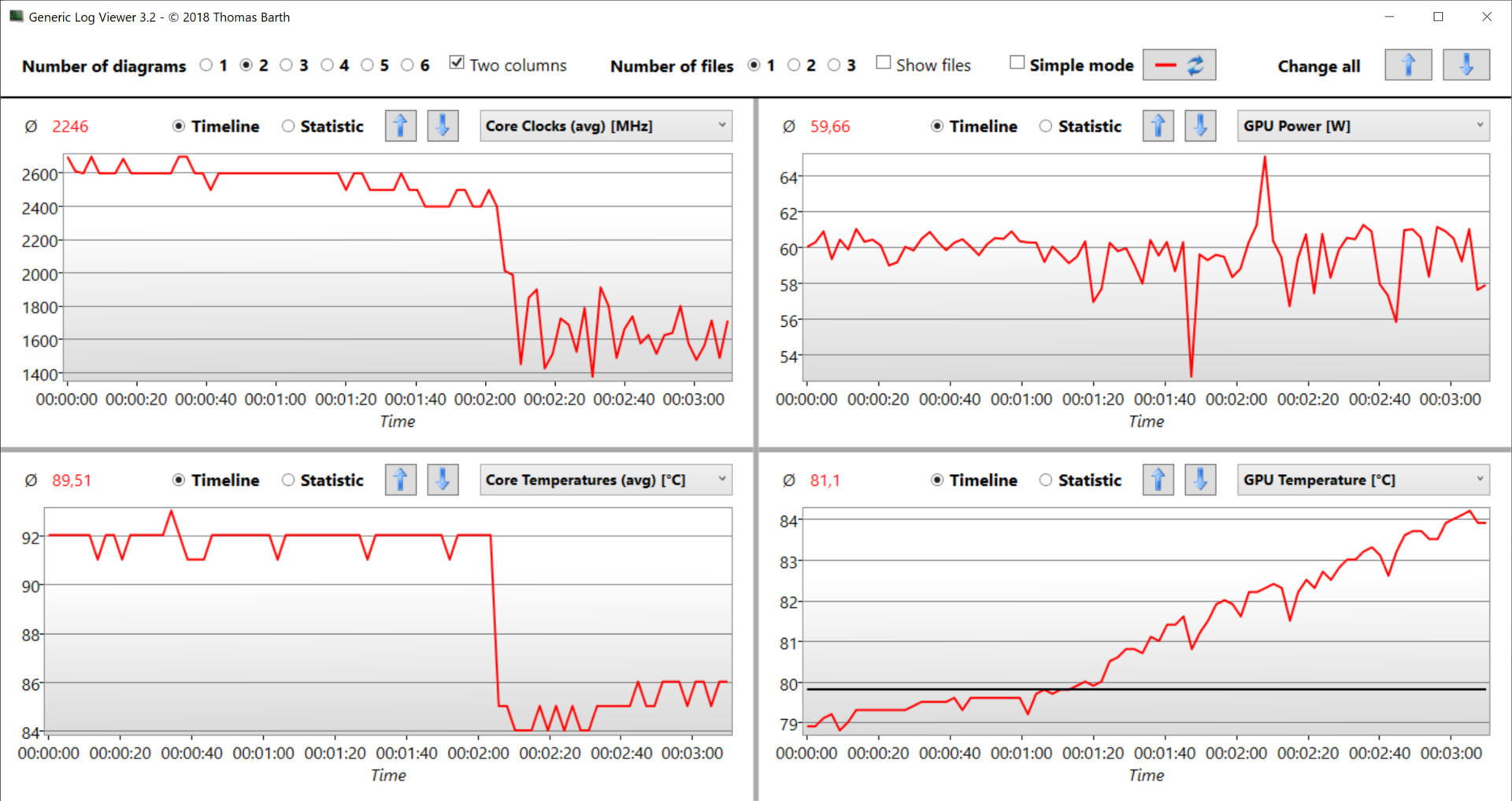 Bemerkenswert: Die GPU-Temperatur der RTX steigt langsamer an, die Grafikkarte kann dauerhaft 60 Watt abrufen. Entweder ist die GPU-Thermik komplett von der CPU getrennt, oder aber die GPU hat Vorrang.