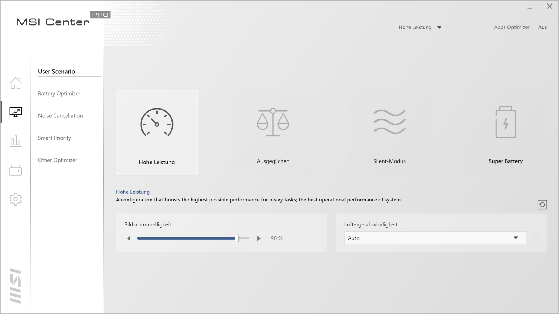 Das Tastenfeld kommt mit einer Mini-LED-Tastaturbeleuchtung, das heißt jeder Buchstabe kann in einer anderen Farbe beleuchtet werden. Das Pre-Install schlägt erstmal mit einem sich bewegenden Licht auf. Wenn das stört oder anderen Farben oder Mischungen eingestellt werden sollen, dann muss Mystic Light installiert werden. MSI Center Pro gibt eine Modifikation der Tastenbeleuchtung leider nicht her.