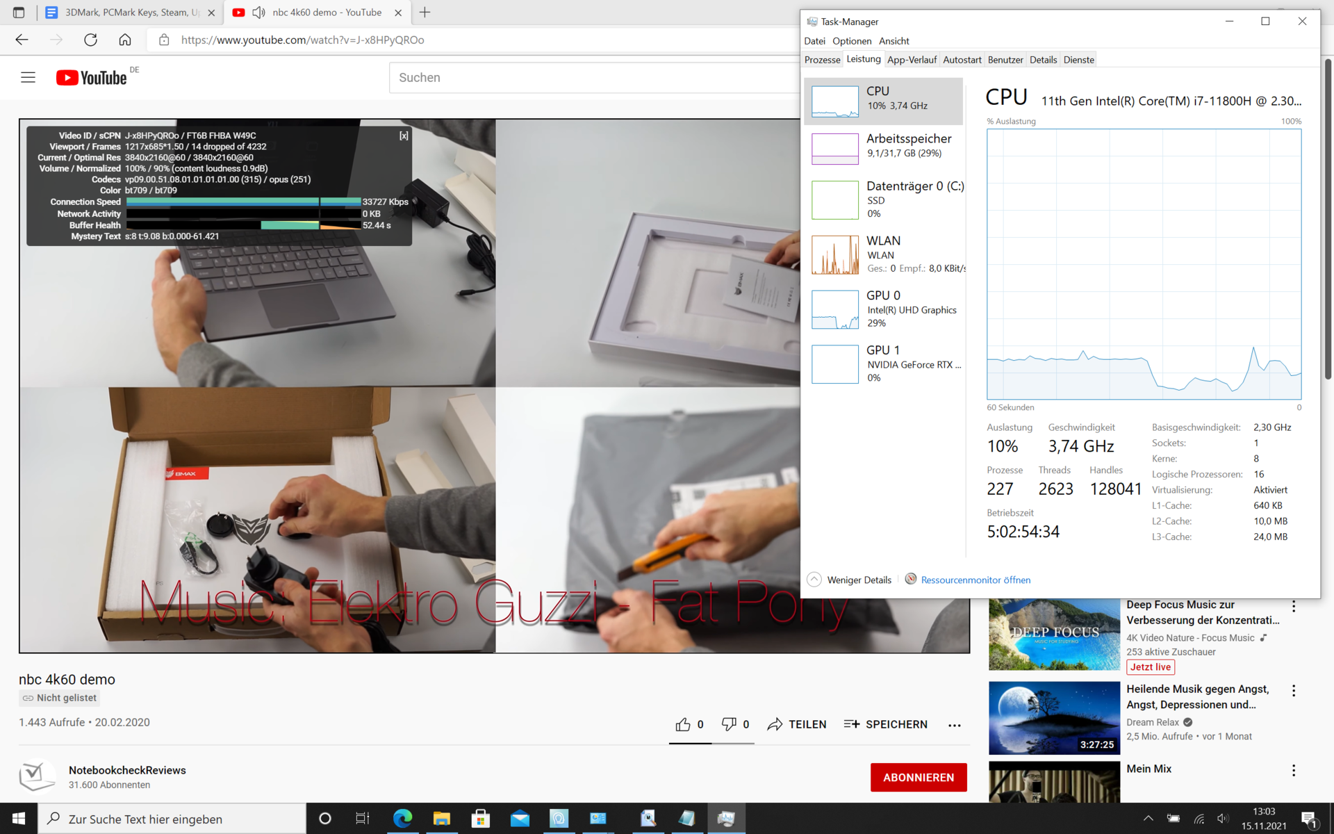 Wie unsere Stichproben zeigen, entfaltet sich die Leistung zu Gunsten der RTX 3060 - sollten CPU und GPU gleichermaßen belastet sein. So rechnet die GPU während eines CPU-Stresstest weiterhin mit 60 von 65 Watt. Infolgedessen ist die Spiele-Performance über die Zeit stabil. Dennoch ackert die RTX 3060 leicht unterdurchschnittlich (Games und synthetische Benchmarks), was aber der generellen Spiele-Tauglichkeit keinen Abbruch tut.