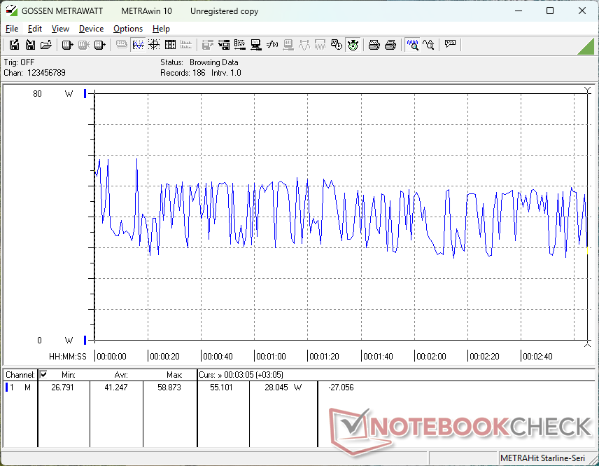 Der Gesamtverbrauch ist spürbar niedriger als bei einem Mini-PC der AMD H-Serie wie dem GMK NucBox K12 obwohl unser integrierter Arc 140V beim Spielen ungefähr mit dem integrierten Radeon 780M der Konkurrenz vergleichbar ist. Das Performance-Pro-Watt-Verhältnis spricht im Allgemeinen für das MSI Cubi, wenn auch auf Kosten der Rohleistung im Vergleich zu vielen AMD Zen 4 oder Zen 5 Alternativen.