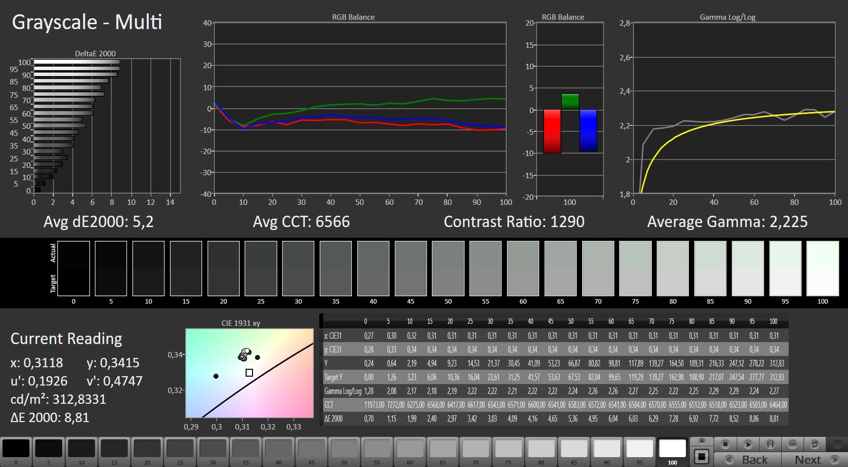 | Delta E Graustufen * | 5.2 | 6.5 -25% | 1.5 71% | 2.3 56% |