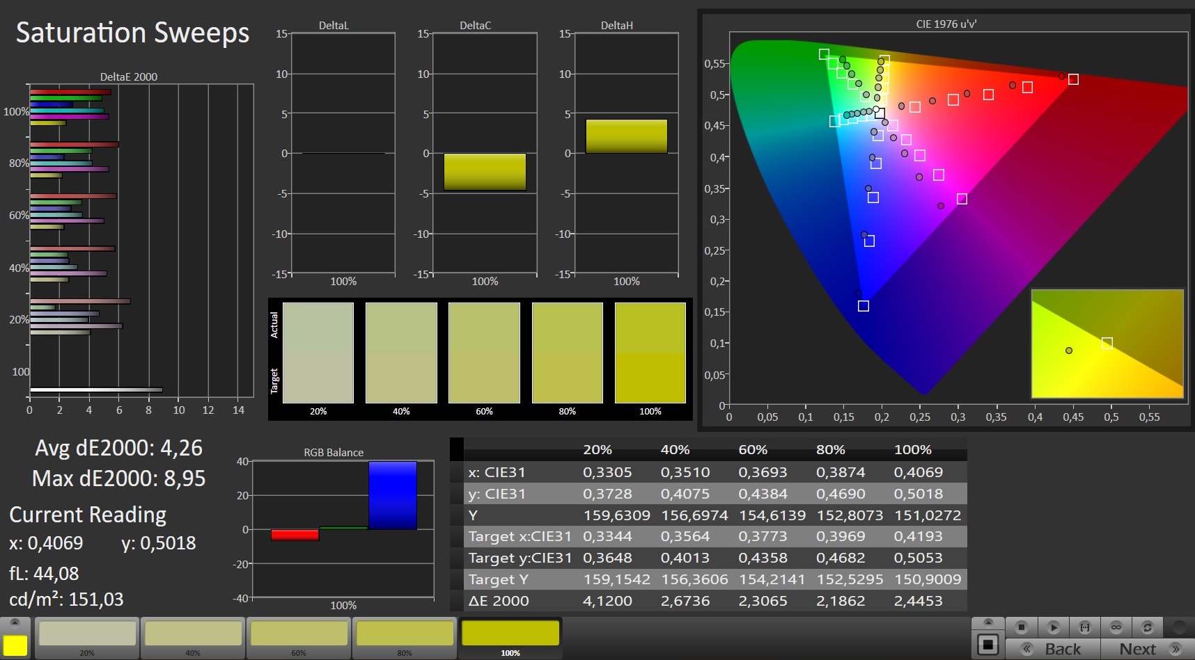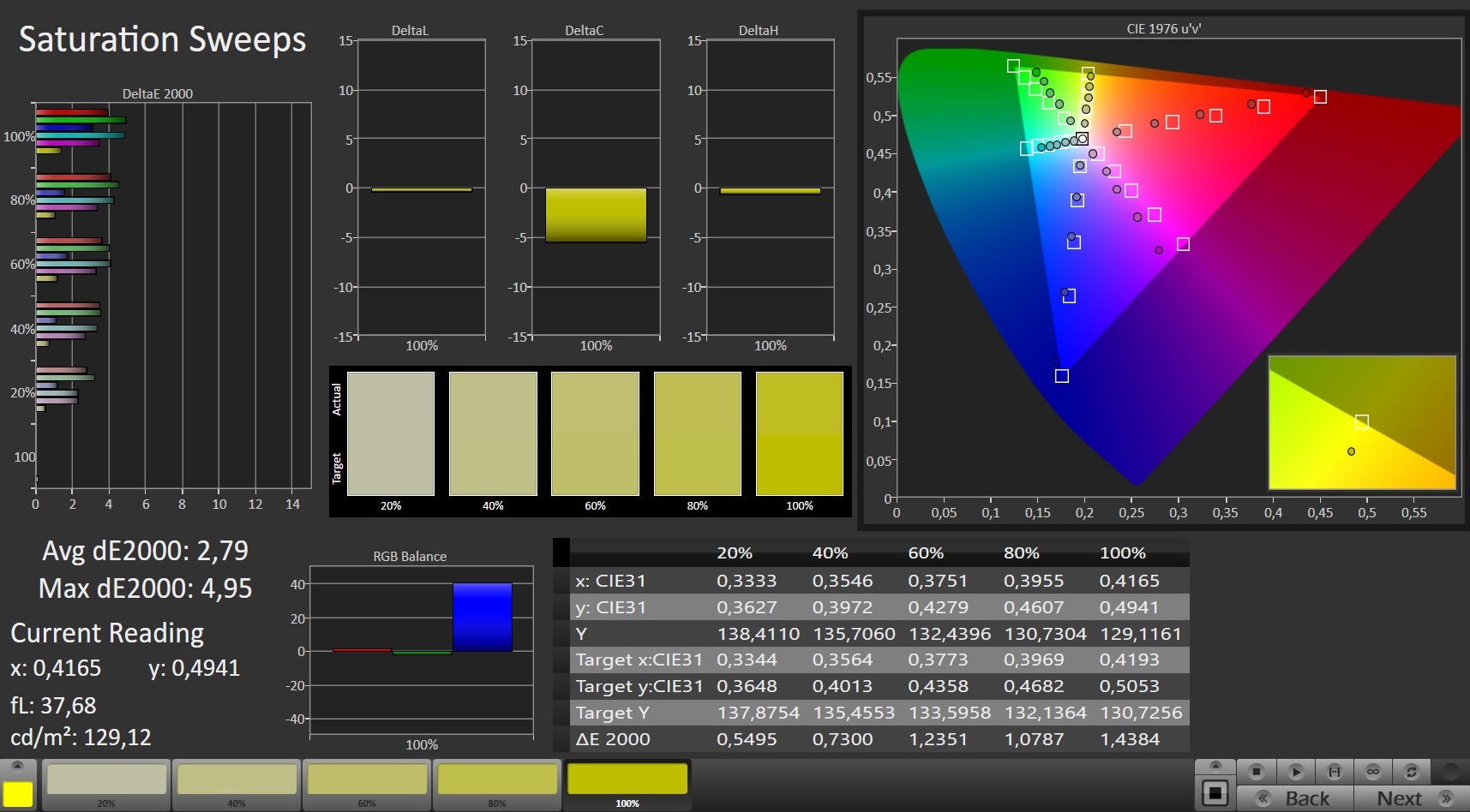 Die CalMAN-Analyse zeigt außerdem, dass Farben mit einer DeltaE2000-Abweichung von 5,66 angezeigt werden. Durch eine Kalibration lässt sich dieser Wert auf 2,7 senken. Die entsprechende ICC-Datei kann im Fenster oben rechts neben der Grafik zur Ausleuchtung des Bildschirms heruntergeladen werden.