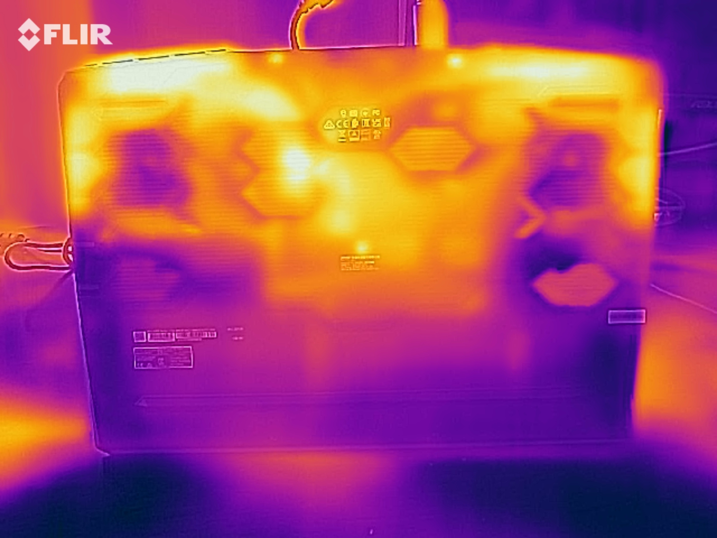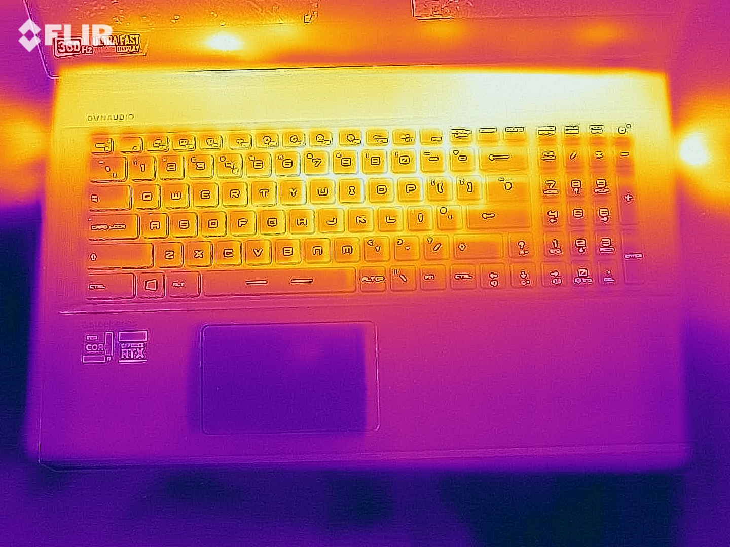 Laut unseren Messungen erwärmen sich die Oberflächen des MSI-Notebooks auf bis zu 50 °C unter Last. Der wärmste Punkt liegt dabei an der hinteren linken Ecke der Unterseite. Die Temperatur der Handballenauflagen ist mit bis zu 34 °C stets moderat.