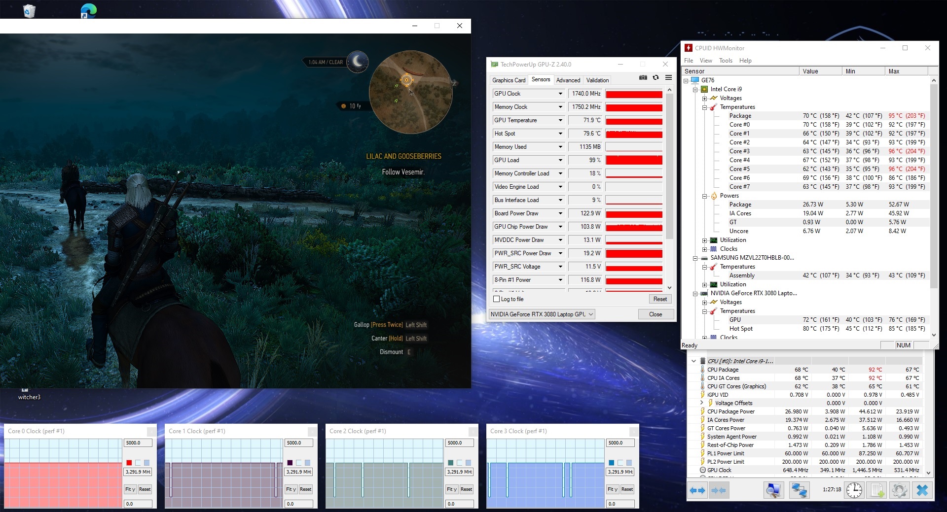 Während unseres Dauerstresstests stiegen die Temperaturen im Inneren auf bis zu 97 °C, wobei die CPU-Taktraten mit circa 2,6 GHz nicht unter den Basistakt fielen. Im The-Witcher-3-Dauertest wurden Temperaturen von bis zu 96 °C erreicht, die Taktraten lagen hierbei aber nicht unter 3,3 GHz. Daher muss auch bei längerer Last nicht mit Performanceeinschränkungen oder einer Drosselung der Leistung gerechnet werden.