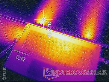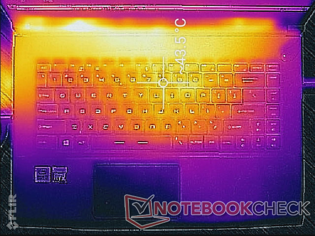 Die Oberflächentemperaturen sind zu den hinteren Quadranten hin am wärmsten, weg von den WASD- und den Pfeiltasten. Hotspots können beim Spielen bis zu 44 °C warm werden, was sehr nahe an den Werten liegt, die wir mit dem älteren GF65 9SD gemessen haben. Der Großteil der Unterseite bleibt beim Spielen relativ kühl.