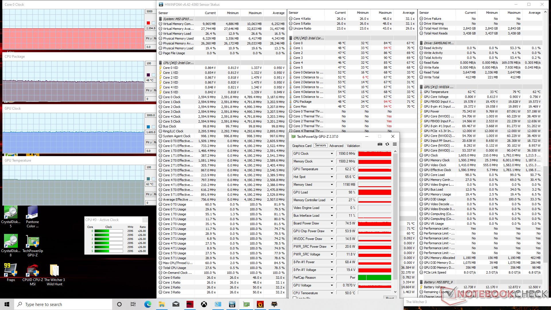 Beim Ausführen von Witcher 3 stabilisieren sich CPU und GPU bei 65 C bzw. 77 °C, was für ein Gaming-Notebook relativ kühle Bereiche sind. Die Aktivierung von Cooler Boost würde die CPU- und GPU-Temperaturen sogar noch weiter auf nur 48 °C bzw. 62 °C senken, während die durchschnittlichen GPU-Taktraten nur leicht von 1515 MHz auf 1590 MHz steigen. Das Cooler-Boost-Feature ist also nicht unbedingt notwendig für Spiele, aber es kann für diejenigen nützlich sein, die maximale CPU-Turbo-Boost-Leistung aus ihrem GF65-System herausholen wollen.