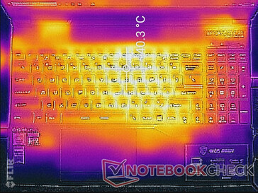 Bei Witcher 3 stiegen die Oberflächentemperaturen in der Mitte der Tastatur auf maximal 49 °C und 39 °C im Bereich der WASD-Tasten. Glücklicherweise blieben die Handballenablagen erheblich kühler.