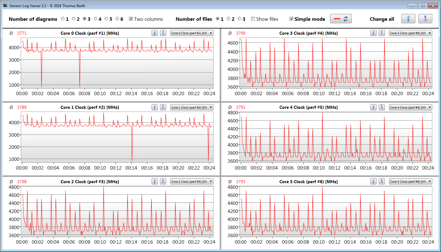 Den Multi-Thread-Test des Cinebench-R15-Benchmarks bearbeitet der Prozessor kurzzeitig mit 3,4 bis 4,2 GHz. Dann sinkt der Takt auf 3,3 bis 3,9 GHz. Der Single-Thread-Test wird mit 4,2 bis 4,6 GHz durchlaufen. Im Akkubetrieb liegen die Geschwindigkeiten bei 1,6 bis 1,9 GHz (Multi-Thread) bzw. 3,2 bis 4,6 GHz (Single-Thread).