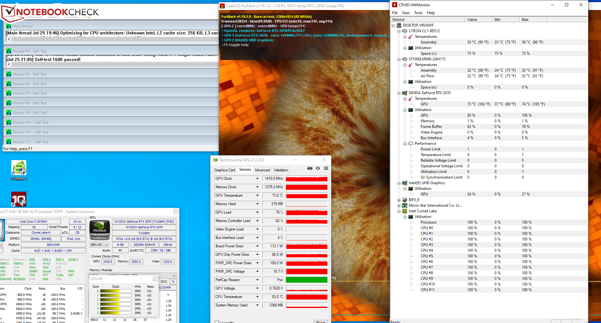 Unseren Stresstest (Prime95 und FurMark laufen für mindestens eine Stunde) bearbeiten CPU bzw. GPU mit 3,1 GHz bzw. 1.400 bis 1.450 MHz. Im Akkubetrieb liegen die Taktraten bei 1,6 bis 1,9 GHz (CPU) bzw. 300 MHz (GPU). Der Stresstest stellt ein Extremszenario dar, welches so im Alltag nicht auftritt. Wir überprüfen mit diesem Test, ob das System auch bei voller Auslastung stabil läuft.