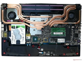 Der Unterboden des GP75 Leopard kann entfernt werden, nachdem alle entsprechenden Schrauben gelöst sind. Daraufhin lassen sich der Arbeitsspeicher austauschen, die Massenspeicher wechseln oder eine zusätzliche SSD über den zweiten M.2-Steckplatz einbauen. Der maximale RAM ist dabei auf 64 GB begrenzt.