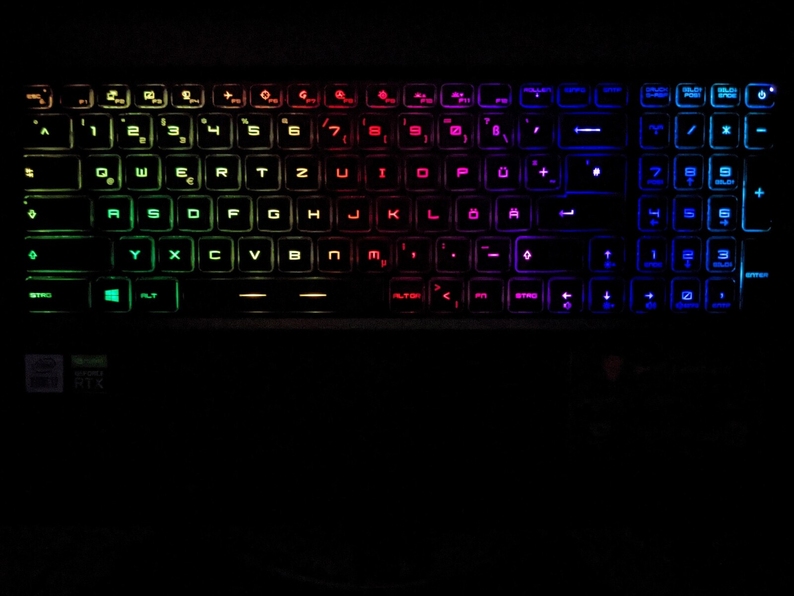Die Tastatur des GP76 Leopard 10UG bietet einen spürbaren Druckpunkt und den Fingern einen festen Halt, womit sie auch für Vielschreiber gut geeignet ist. Während die Pfeiltasten in der Größe der Buchstabentasten gehalten sind, fallen die F-Tasten deutlich kleiner aus. Das MSI-Notebook besitzt außerdem eine RGB-Beleuchtung, welche sich umfangreich konfigurieren lässt.