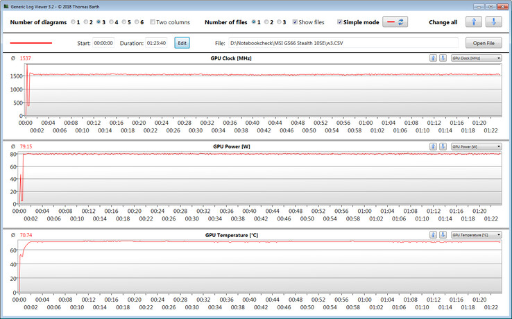 Unseren Stresstest (Prime95 und FurMark laufen für mindestens eine Stunde) bearbeiten Prozessor bzw. Grafikkern mit 2,5 bis 2,7 GHz bzw. 1.390 bis 1.400 MHz. Im Akkubetrieb liegen die Taktraten bei 1,9 bis 2 GHz (CPU) bzw. 1.300 bis 1.350 MHz (GPU). Der Stresstest stellt ein Extremszenario dar, welches so im Alltag nicht auftritt. Wir überprüfen mit diesem Test, ob das System auch bei voller Auslastung stabil läuft.