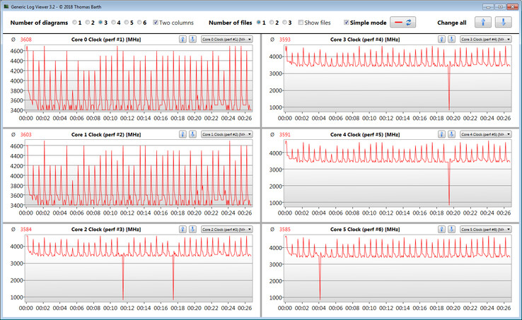 Den Multi-Thread-Test des Cinebench-R15-Benchmarks bearbeitet der Prozessor kurzzeitig mit 4 bis 4,1 GHz. Dann sinkt der Takt auf 3,6 bis 3,8 GHz. Der Single-Thread-Test wird mit 4,2 bis 4,6 GHz durchlaufen. Im Akkubetrieb liegen die Geschwindigkeiten bei 2,6 bis 2,9 GHz (Multi-Thread) bzw. 2,6 bis 4,2 GHz (Single-Thread).