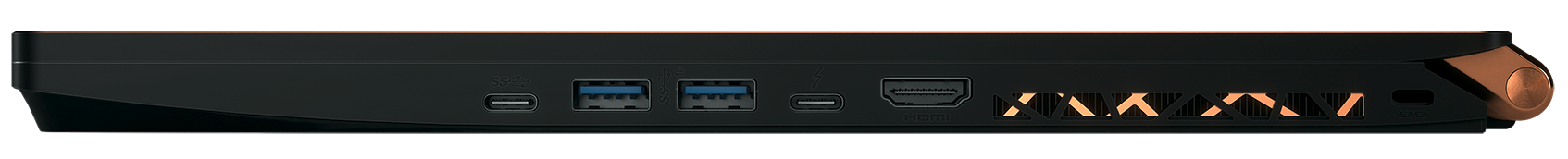 Fast die Hälfte der Unterseite des Notebooks ist mit einem Gitter versehen, das einen optimale Belüftung gewährleistet. Im hinteren Drittel der Seiten und auf der Rückseite befinden sich mehrere Luftauslässe, die eine rasche Abfuhr der entstehenden Wärme sicherstellen. Neben einem HDMI- und USB-Typ-A-Anschlüssen mit USB-3.1-Gen2-Standard verfügt das MSI GS75 Stealth auch über USB-3.1-Gen-1-Typ-C-Port sowie einen vollwertigen Thunderbolt-3-Anschluss. Getrennte 3,5-mm-Klinkeports für Mikrofon sowie Kopfhörer, ein MicroSD-Kartenschacht sowie Gigabit-LAN komplettieren die Auswahl.