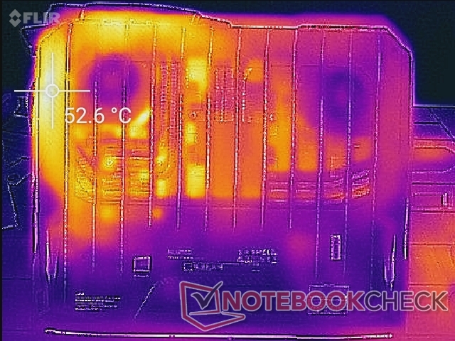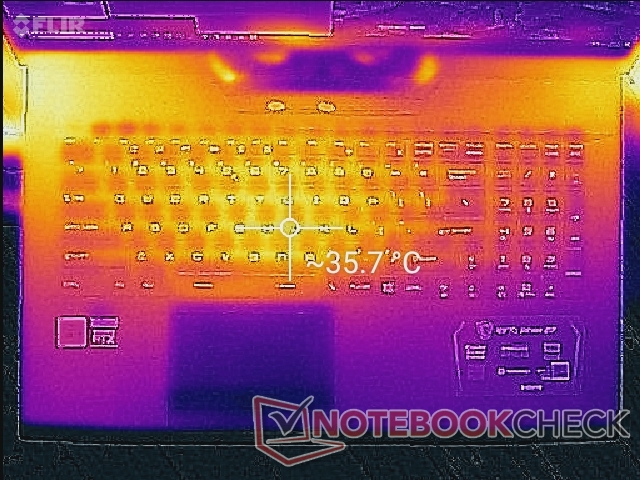 Durch die Vielzahl an Lüftungsgittern und das massive Kühlsystem werden die Oberflächentemperaturen nie unangenehm warm, trotz dem hier die schnellsten erhältlichen Komponenten verbaut sind. Beispielsweise wird die Tastaturmitte nur 36 °C warm, während das ultradünne MSI GS75 hier Temperaturen von 42 bis 47 °C erreicht. Die Hotspots befinden sich noch am ehesten an den Ecken der Rückseite, wo man eher selten die Hände auflegt.