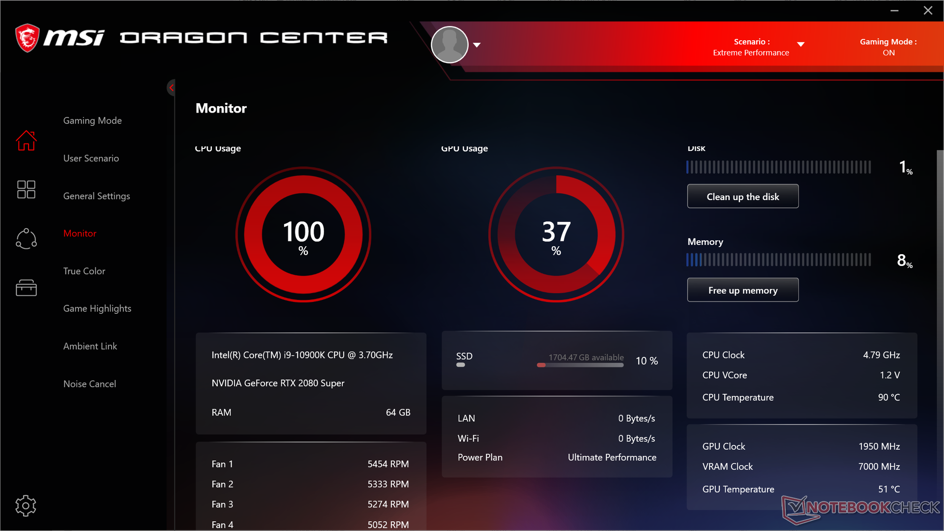 Wenn Prime95 im Turbo-Fan-/Cooler-Boost-Modus läuft, dann boosten die Kerne auf 4.8 GHz hoch und stabilisieren sich dort auch. Da Intel einen maximalen Boosttakt von eben genau 4,8 GHz für seinen Core i9-10900K auslobt, ist es schon absolut beeindruckend, dass das GT76 in der Lage ist diesen Takt zu halten - wohlgemerkt in einem Laptopgehäuse, immerhin ist die CPU für Desktops konzipiert! Die Kerntemperaturen stabilisieren sich erst bei hohen 89 °C, sodass eigentlich kaum noch Spielraum für Übertaktungsversuche bleibt. Dennoch sind die Temperaturen besser als das, was wir beim Alienware Area-51m beobachtet haben.
