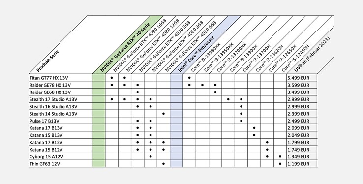 MSI hat im Rahmen der CES im Januar zahlreiche neue Gaming-Laptops auf Basis von GeForce RTX 4000 vorgestellt, mittlerweile hat der Hersteller die unverbindliche Preisempfehlung für Deutschland bestätigt. Die unten eingebettete Tabelle zeigt übersichtlich, mit welchen Intel-Prozessoren und Nvidia-Grafikchips das neueste Gaming-Laptop-Portfolio von MSI aufwarten kann.