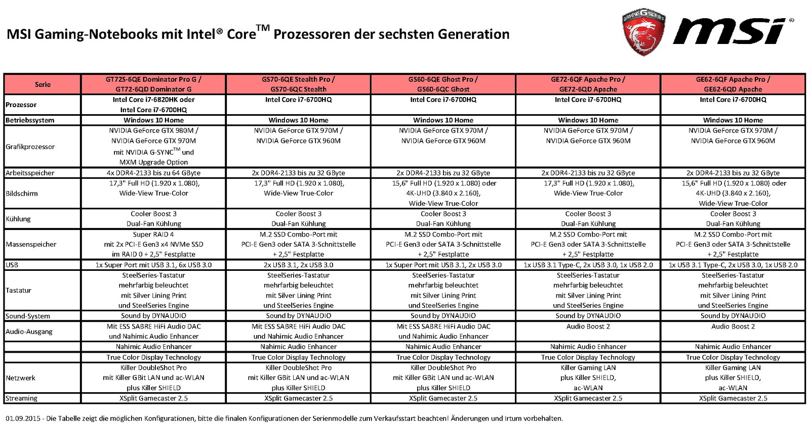 Die Intel Core Mobile Prozessoren der 6. Generation mit dem bisherigen Codenamen Skylake sind da. Stark: Pünktlich dazu präsentiert MSI sein komplett überarbeitetes Line-up bei den sehr gut ausgestatteten Gaming-Notebooks der folgender Laptop-Serien: