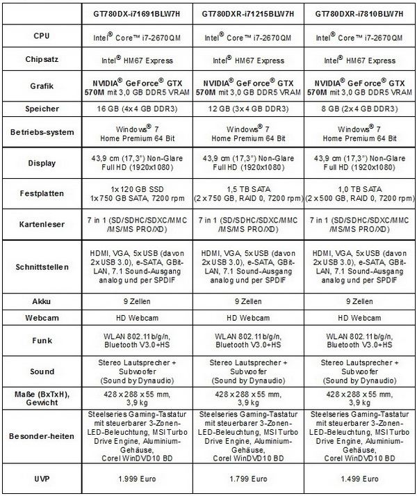 Der Daddel-Spass mit den portablen Spieleboliden der Serie GT780DX von MSI beginnt bei 1.499 Euro mit dem Modell GT780DXR-i7810BLW7H. Dafür bekommt der Kunde einen schnellen Intel Quad-Core i7-2670QM, 8 GByte DDR3-RAM, eine Nvidia Geforce GTX 570M mit 3,0 GByte DDR5-VRAM und 1 TByte Festplattenspeicher.