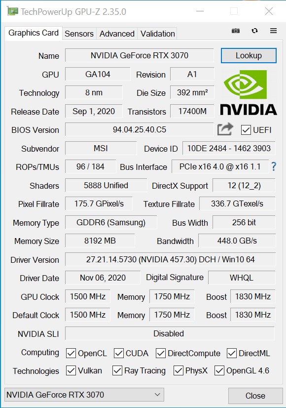 - MSI GeForce RTX 3070 Gaming X Trio (Treiber Nvidia 457.30)