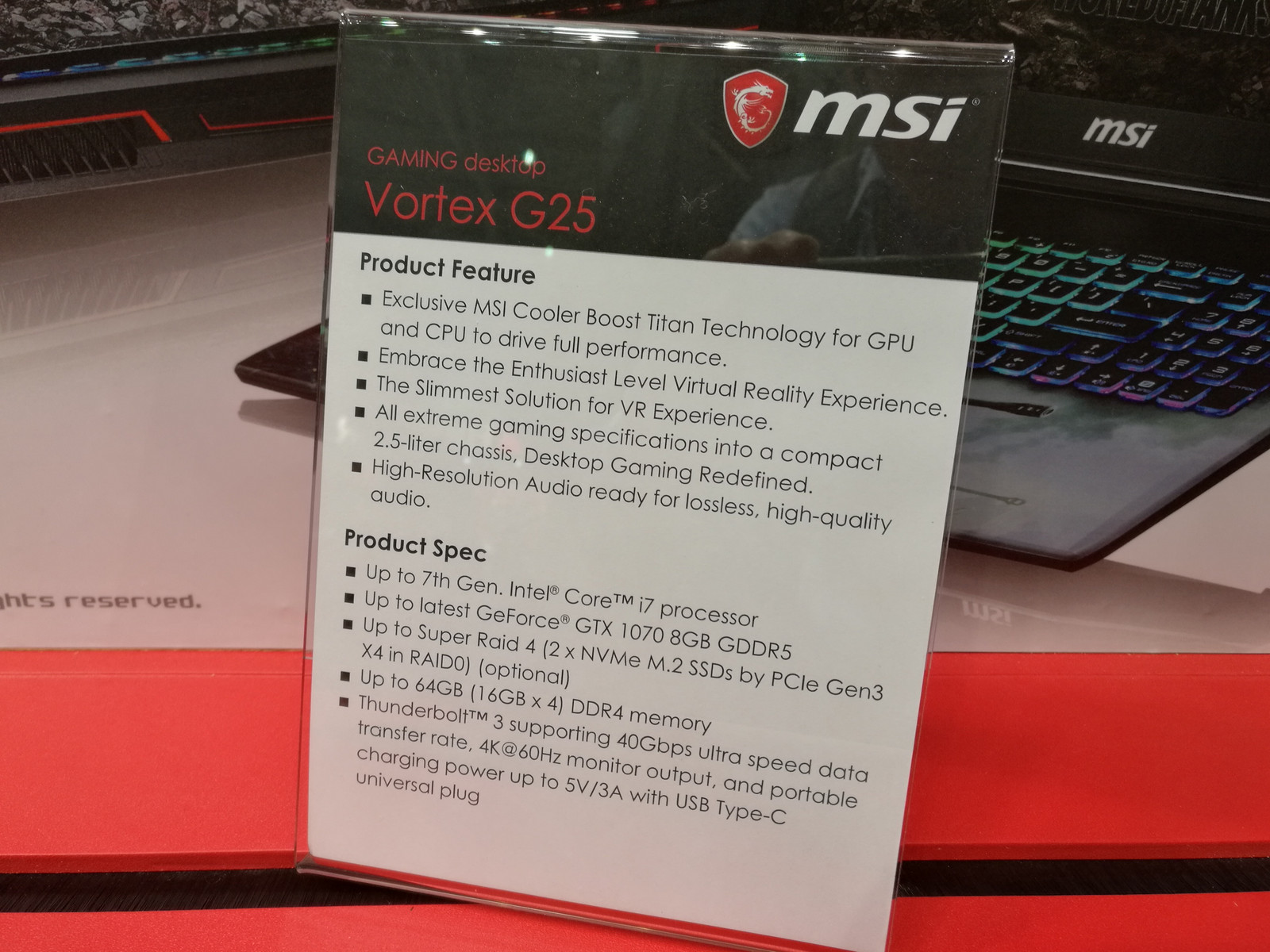 Auf dem Datenblatt steht, dass MSI seine Geräte mit Intel-Core-i7-Prozessoren der siebten Generation ausstatten will, am Stand erfahren wir aber, dass das ein Fehler im Datenblatt ist, der Vortex G25 wird bereits die nächste Generation der Intel-Prozessoren an Bord haben. Da das Device im August oder Dezember erscheinen soll, können wir uns wohl in diesem Zeitrahmen auch auf News von Intel freuen, wie es aussieht.