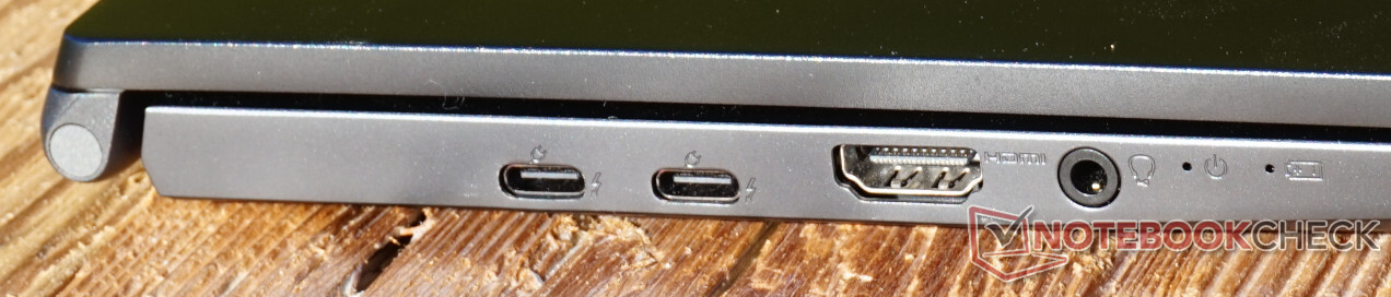 Anzahl und Geschwindigkeit der Anschlüsse können sich sehen lassen. Insbesondere zweimal Thunderbolt 4 links bieten eine variable Nutzung und hohe Übertragungsgeschwindigkeiten. Zwar wird hierüber auch der Akku geladen; weil es aber zwei Anschlüsse nebeneinander gibt, bleibt einer stets frei. Die beiden normalen USB-A-Anschlüsse erreichen erfreulicherweise 10 Gbit/s, was in vielen Fällen sogar für eine externe SSD genügen dürfte.