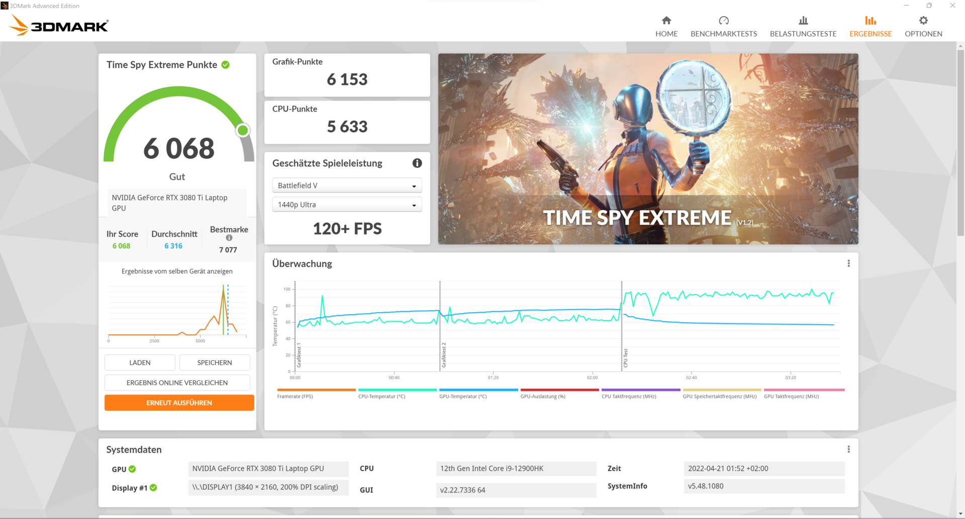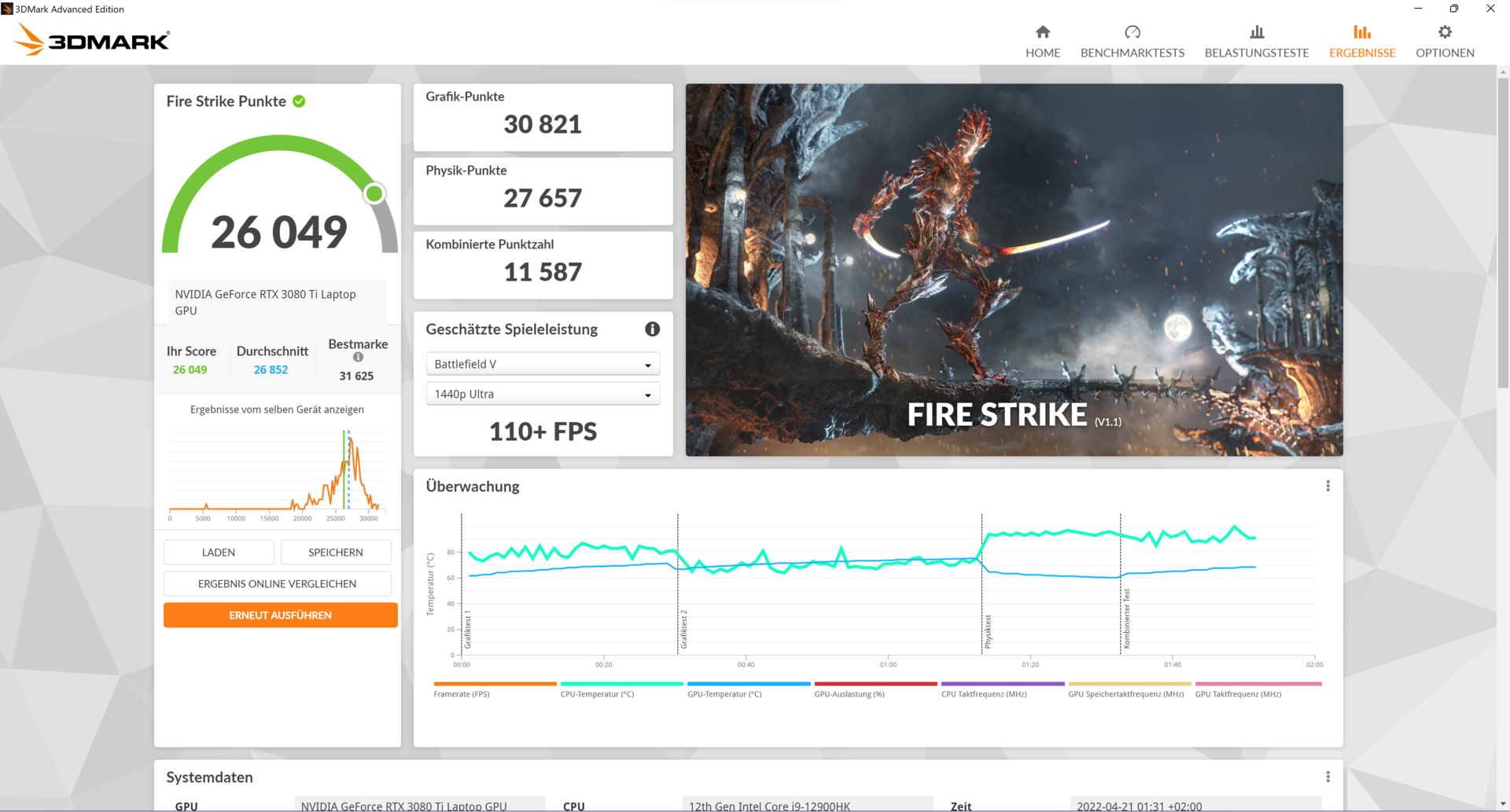 | MSI Raider GE66 12UHS Intel Core i9-12900HK, | MSI GE66 Raider 10SFS Intel Core i9-10980HK, | Razer Blade 15 2022 Intel Core i7-12800H, | Schenker XMG Neo 15 E22 (Early 2022, RTX 3080 Ti) Intel Core i7-12700H, | Lenovo Legion 5 Pro 16 G7 i7 RTX 3070Ti Intel Core i7-12700H, | Durchschnitt der Klasse Gaming | |