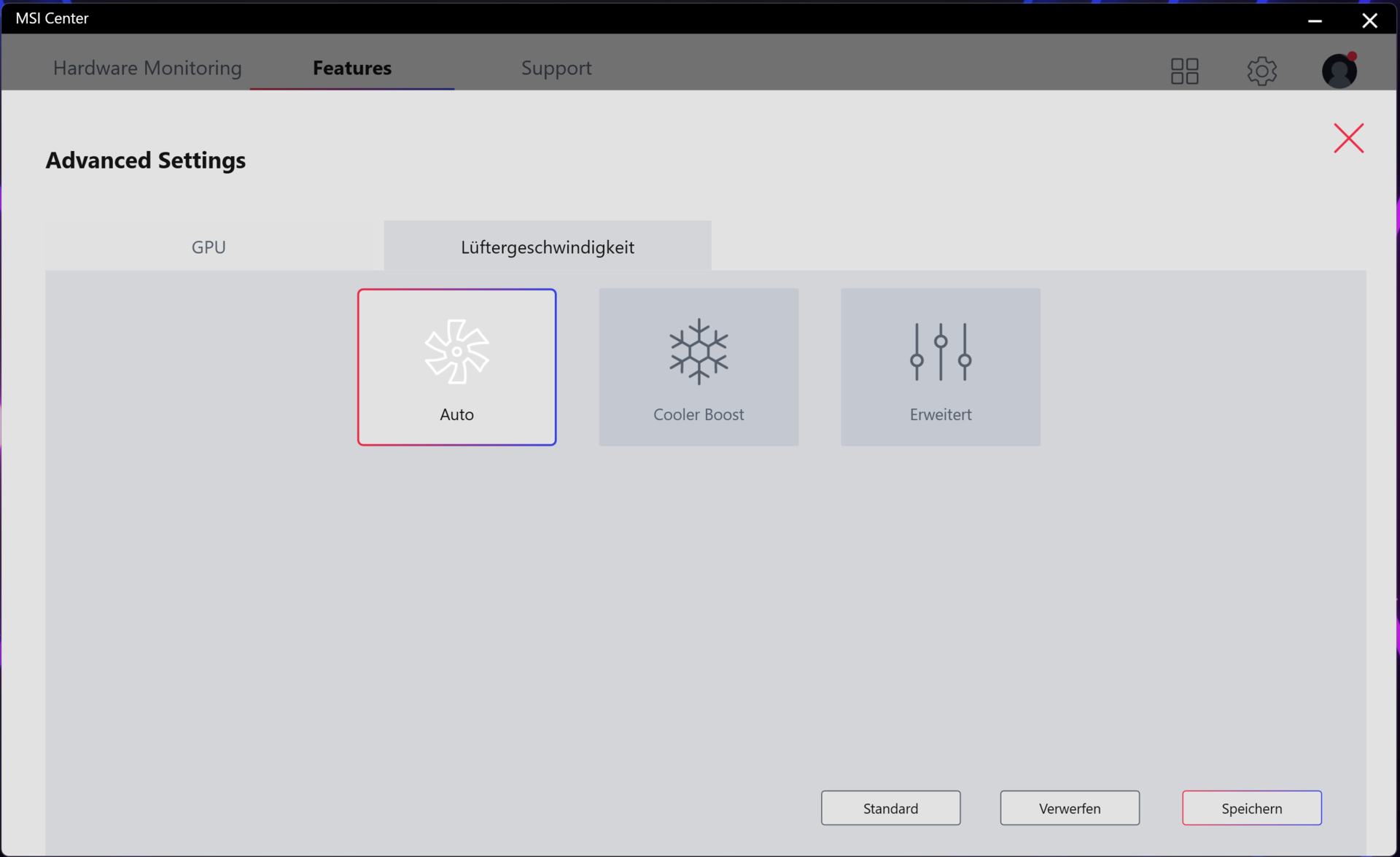 Das Profil "Extreme Leistung" bietet diverse Tuning-Optionen. Eine Übertaktung der GPU und des Grafikspeichers wäre möglich. Darüber hinaus bestünde Zugriff auf die Lüftersteuerung. Es stehen hier die Optionen "Auto", "Cooler Boost" (Lüfter arbeiten mit Maximalgeschwindigkeit) und "Erweitert" (Anpassung der Lüfterkurven) bereit.
