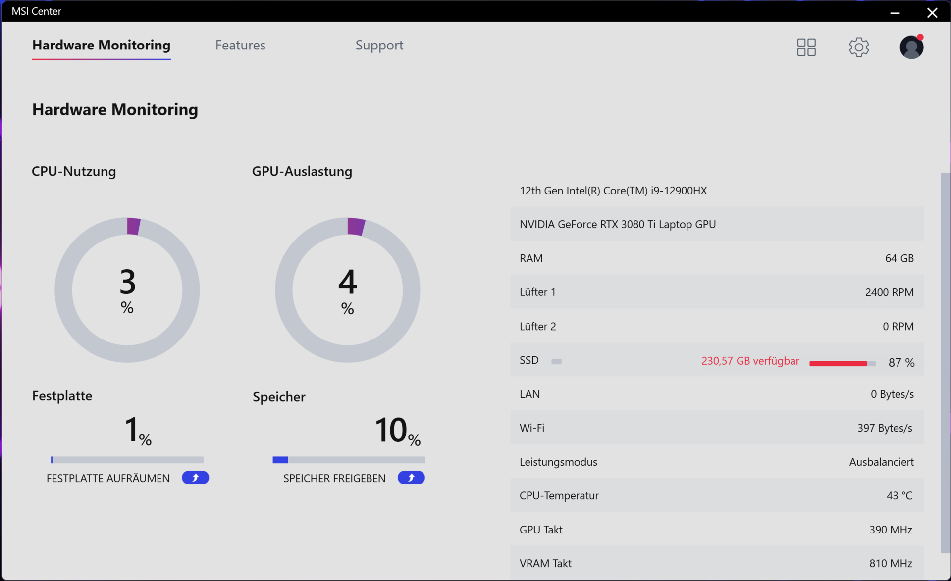 Das Notebook stellt vier Leistungsprofile bereit, die per vorinstallierter MSI-Center-Software manuell gewählt werden können. Wird - wie in unserem Fall - die übergeordnete, AI-basierte "Smart Auto"-Funktion genutzt, wählt das MSI Center automatisch jeweils das zum Szenario passende Profil. Die Funktion erlaubt zudem das Festlegen einer Liste von Anwendungen, bei deren Start das Profil "Extreme Leistung" aktiviert werden soll.