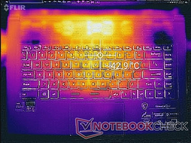 Die Entwicklung der Oberflächen ist sehr symmetrisch zur Auslastung. Der Hot Spot liegt im Bereich der Tastaturmitte und kann sich bei anspruchsvollen Spielen und Aufgaben auf bis zu 43 °C oder gar 45 °C erhitzen. Die Temperaturen liegen dann auf einem ähnlichen Niveau wie beim GS66, was noch immer kühler ist als das XPS 15 oder das Lenovo ThinkPad T15p. Folglich schafft es das MSI eine höhere Grafikleistung anzubieten als die Konkurrenz, wird dabei aber nicht zwangsläufig wärmer.