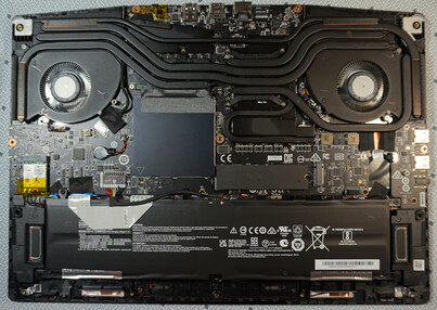 Anschließend sind die Lüfter, der Akku und alle wechselbaren Komponenten unkompliziert erreichbar. Das WLAN-Modul kann gewechselt werden. Zwei Arbeitsspeicher-Slots erlauben die Installationen von maximal 64 GB DDR5-RAM, die im vorliegenden Stealth 17 bereits komplett ausgereizt sind. Zudem findet sich ein freier Steckplatz für eine M.2-SSD.