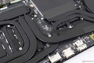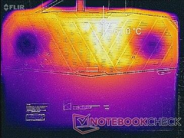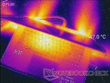Die Hot Spots beim Gaming sind in etwa identisch zu denen des GS76; rund 49 °C bei der Tastatur und etwa 61 °C auf der Unterseite. Die Verteilung ist beim neueren Modell dagegen etwas besser, so dass die Handballenablagen mit nur 30 °C deutlich unterhalb der 35 °C des Vorgängers bleiben.