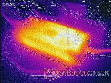 (-) Auf der Unterseite messen wir eine maximalen Wert von 59.6 °C (im Vergleich zum Durchschnitt von 43.3 °C).