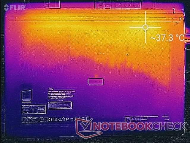 Die Oberflächentemperaturen sind sehr warm, was wahrscheinlich auf die Tatsache zurückzuführen ist, dass eine GeForce-GTX-GPU in einem Gehäuse der Größe eines Ultrabooks steckt. Hotspots im Leerlauf auf dem Desktop können bis zu 37 °C warm werden, wie unsere Temperaturkarten unten zeigen, verglichen mit nur 29 °C beim Prestige 14 Evo ohne dedizierte Grafik. Bei extrem hoher Belastung, wie z. B. bei Spielen, können die Tastaturmitte und die untere Rückseite bis zu 49 bzw. 61 °C warm werden, was wärmer ist als bei den meisten ULV-Ultrabooks und sogar wärmer als bei dem leistungsstärkeren Razer Blade 14