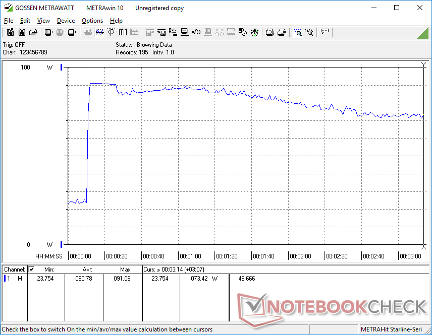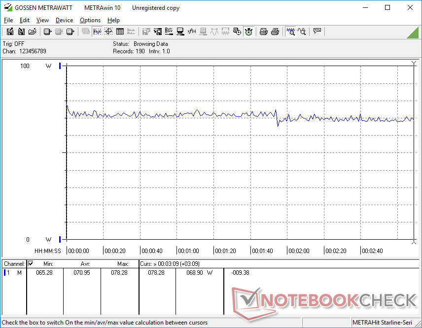 Die Stromverbrauchswerte sind im Leerlauf relativ hoch, was die schlechte Akkulaufzeit in unserem nächsten Abschnitt erklären könnte. Wenn man auf dem Desktop mit der niedrigsten Helligkeitseinstellung und dem Energiesparmodus verbleibt und die integrierte GPU aktiv ist, verbraucht das Notebook fast 10 W und damit doppelt oder dreifach mehr als andere 14-Zoll-Notebooks unter ähnlichen Bedingungen.
