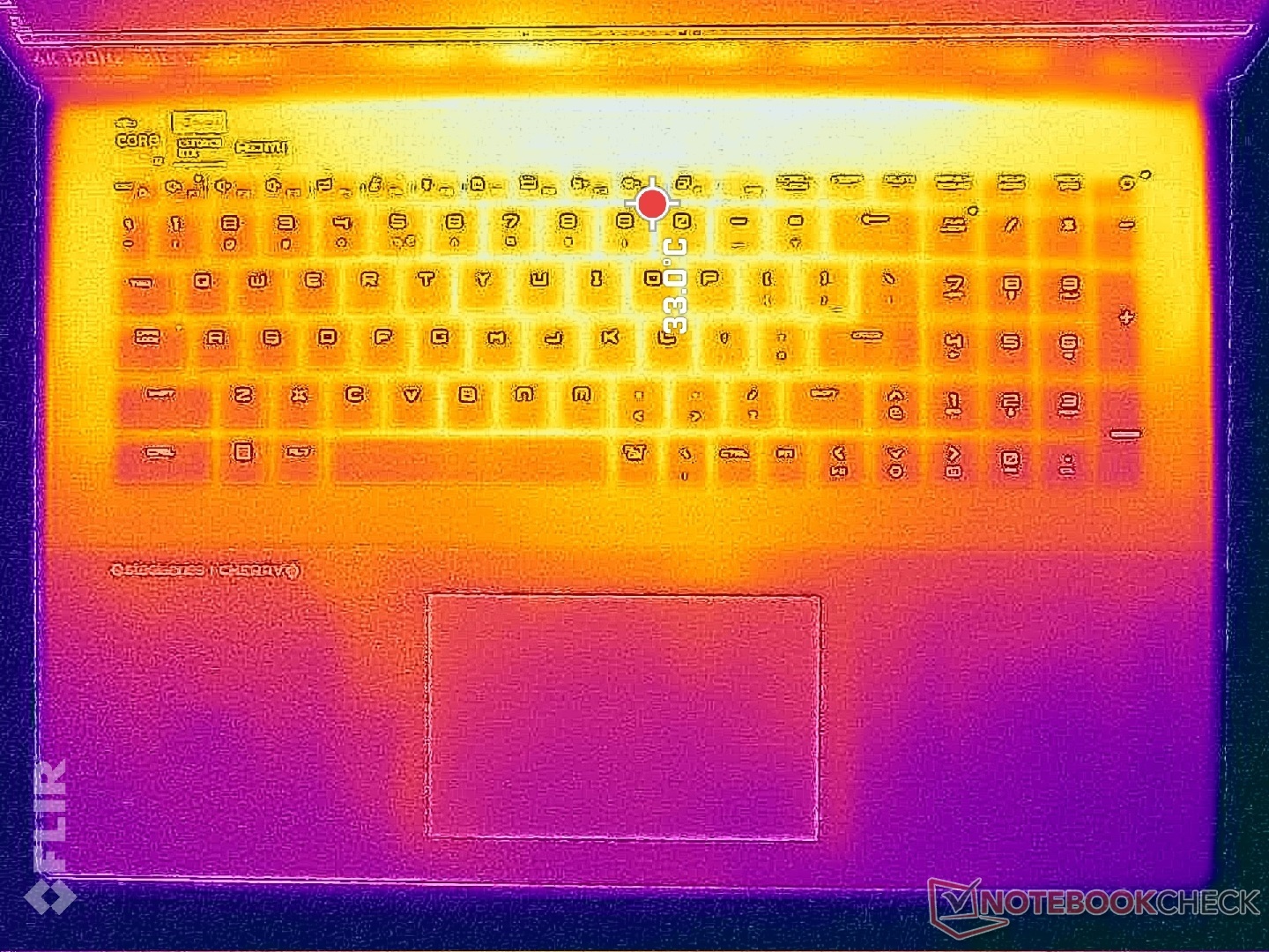 (+) Die Handballen und der Touchpad-Bereich sind mit gemessenen 25.6 °C kühler als die typische Hauttemperatur und fühlen sich dadurch kühl an.