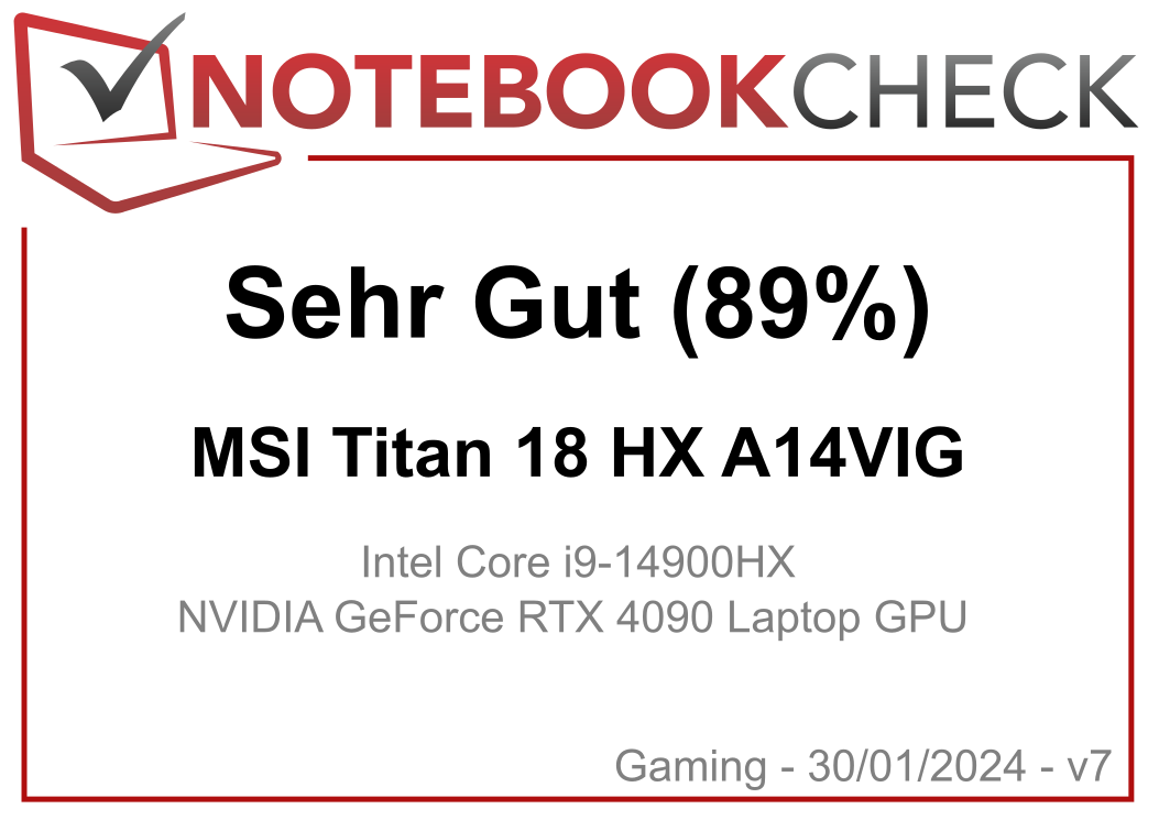 | 88.8 % v7 (old) | 01 / 2024 | MSI Titan 18 HX A14VIG i9-14900HX, GeForce RTX 4090 Laptop GPU | 3.6 kg | 32.1 mm | 18.00" | 3840x2400 | |