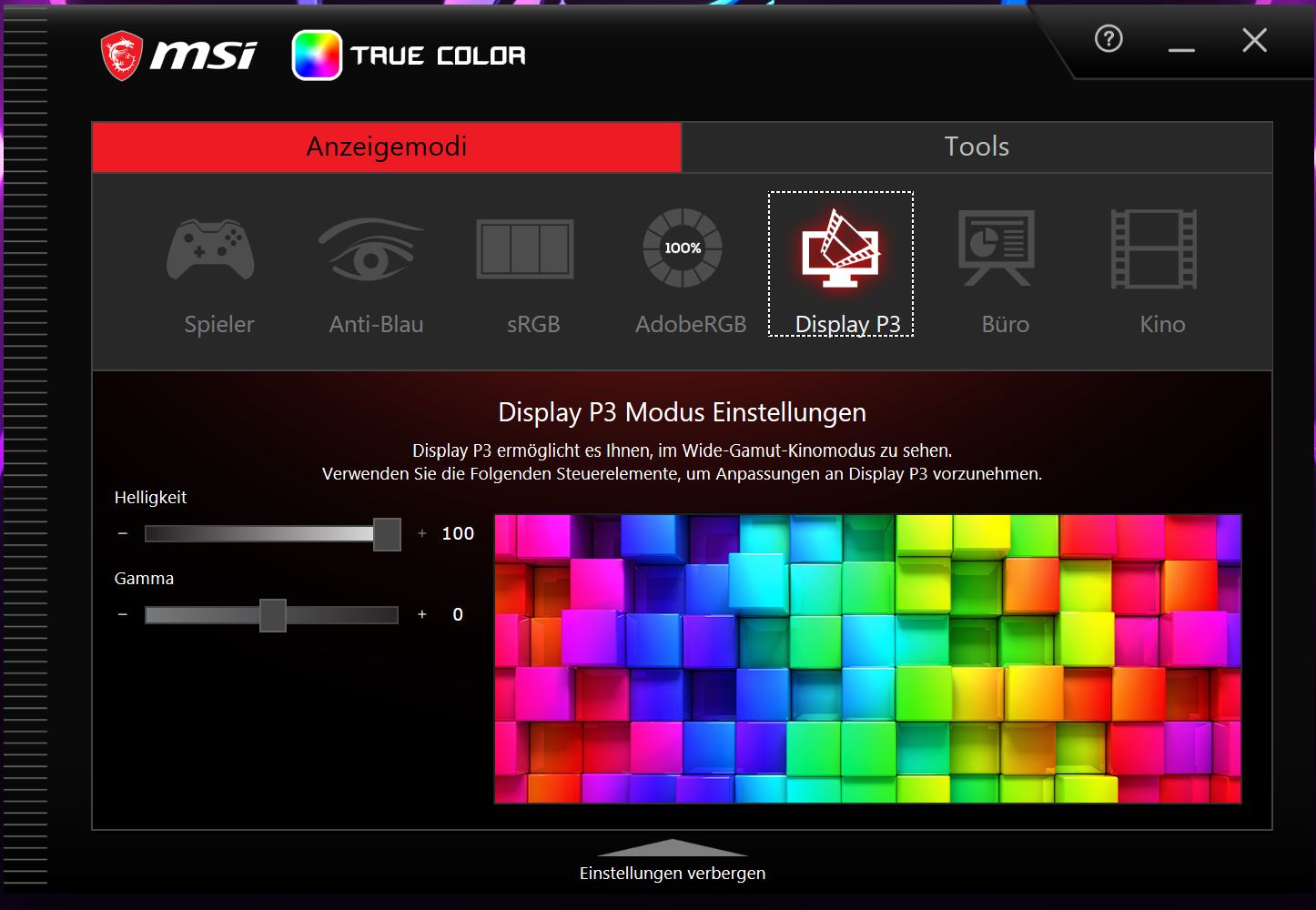 Hinweis: Die MSI-True-Color-Software erlaubt eine Anpassung der Farbdarstellung in Richtung eines Farbraums oder auch eines definierten Anwendungsszenarios. Wir nutzen das Preset "Display P3".