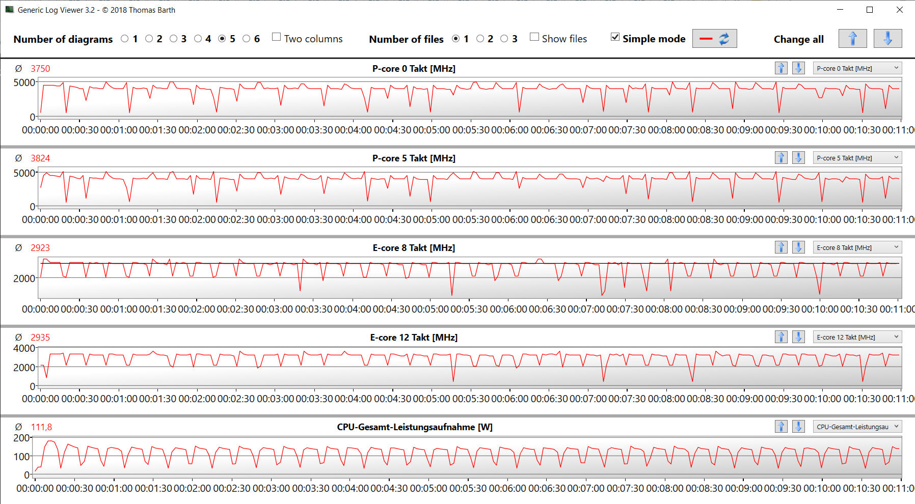 Sowohl der Multi-Thread-Test des Cinebench-R15-Benchmarks (P-Kerne: 4,4 GHz, E-Kerne: 3,3 GHz) als auch der Single-Thread-Test (P-Kerne: 500 MHz bis 5 GHz, E-Kerne: 400 MHz bis 3,6 GHz) werden mit hohen Taktraten durchlaufen. Im Akkubetrieb liegen die Geschwindigkeiten etwas niedriger.