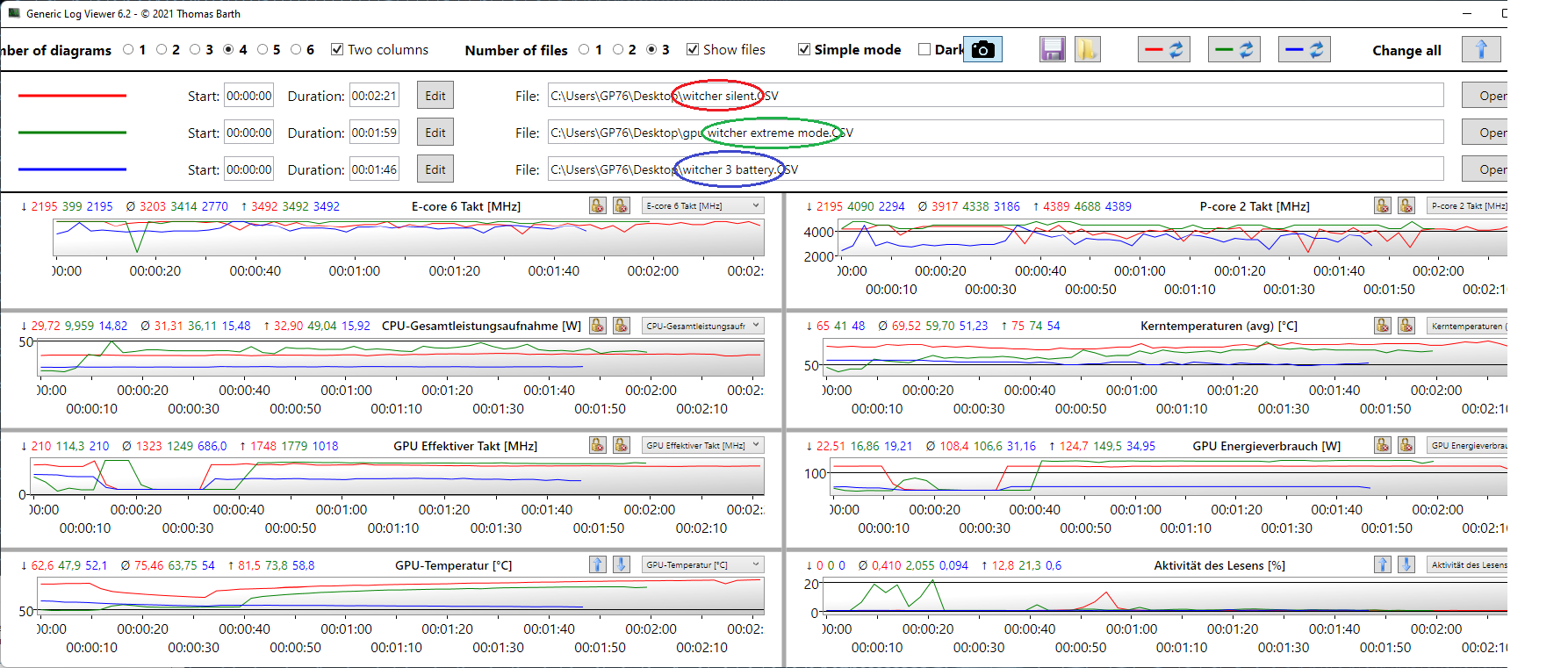 Knapp 200 Watt, unter kombinierter Last und beim Gaming, stellen den dauerhaft maximalen Verbrauch dar. Im Prinzip ist hier ein hoher Wert gut, da es bedeutet, dass die GPU sich viel Strom genehmigen darf und somit schneller werkelt. Bein reiner CPU-Last sollte der Wert (laut HWInfo), je nach Modus, in etwa zwischen 50 und 80 Watt liegen.